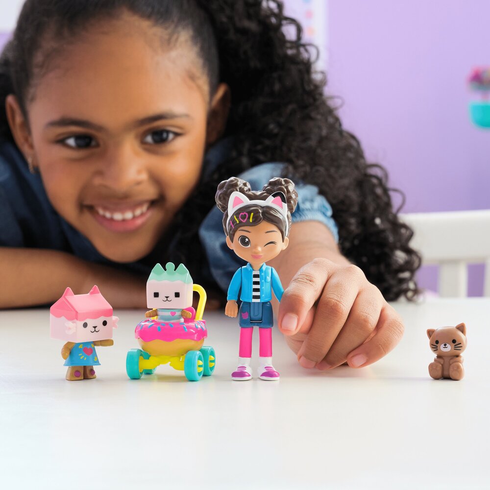 Sadržaj pakiranja: figure Gabby, Baby Box i Baby Benny, kolica u obliku krofne s kotačićima, kutija mačje dostave.