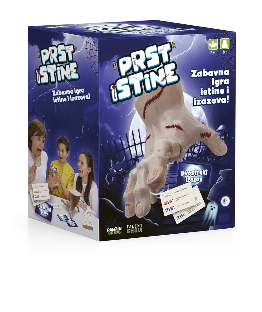 Novo izdanje igre Prst istine donosi još više uzbuđenja! Klince će oduševiti neobična ruka “koja” hoda površinom stola i nasumično bira igrača.Kada izabere igrača, on može birati želi li ispuniti izazov ili odgovoriti na pitanje. Ukoliko tvoji suigrači odluče da zadatak nije ispunjen, slijedi kazna koja se nalazi na svakoj kartici. Inovativna elektronska ruka neobičnog izgleda donosi element iznenađenja i zabave, čineći igru dinamičnom i atraktivnom za djecu. Idealna je za grupne aktivnosti jer potiče interakciju i smijeh među igračima. Igra je namijenjena za 2+ igrača. Preporučena dob: 8+.