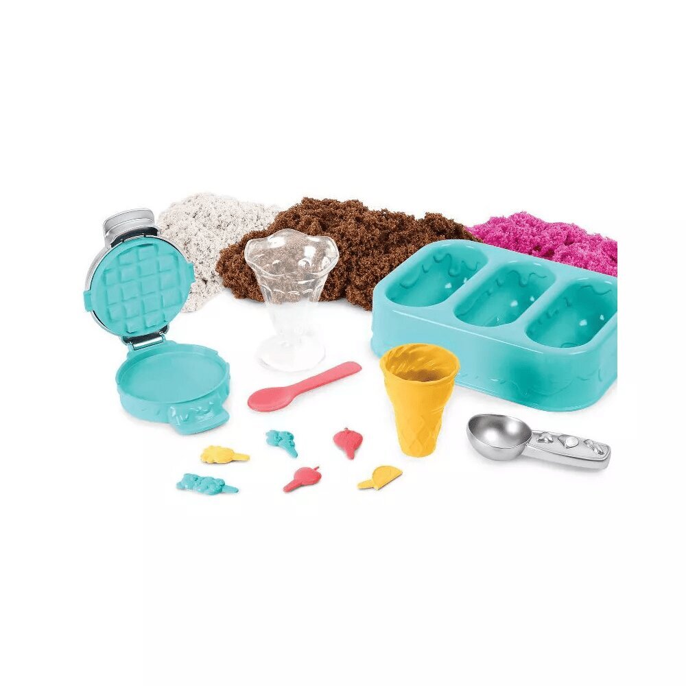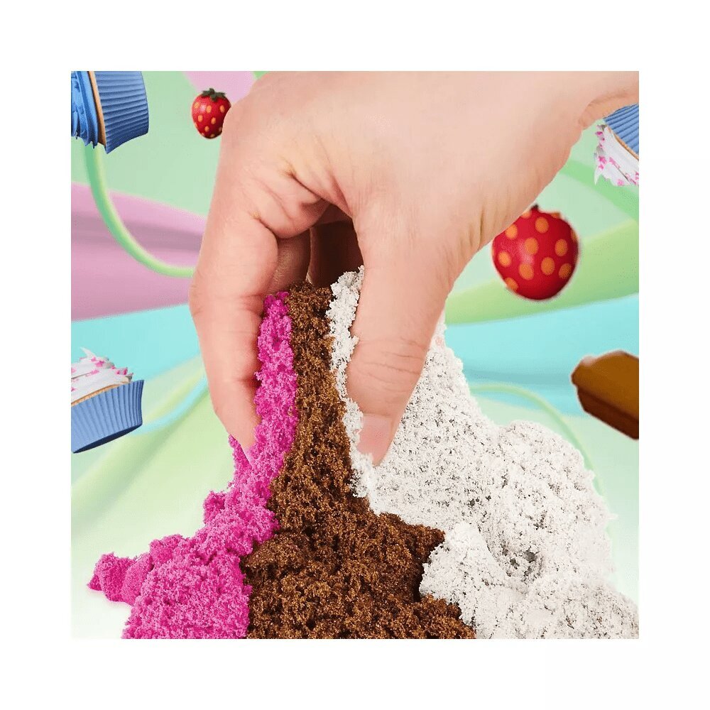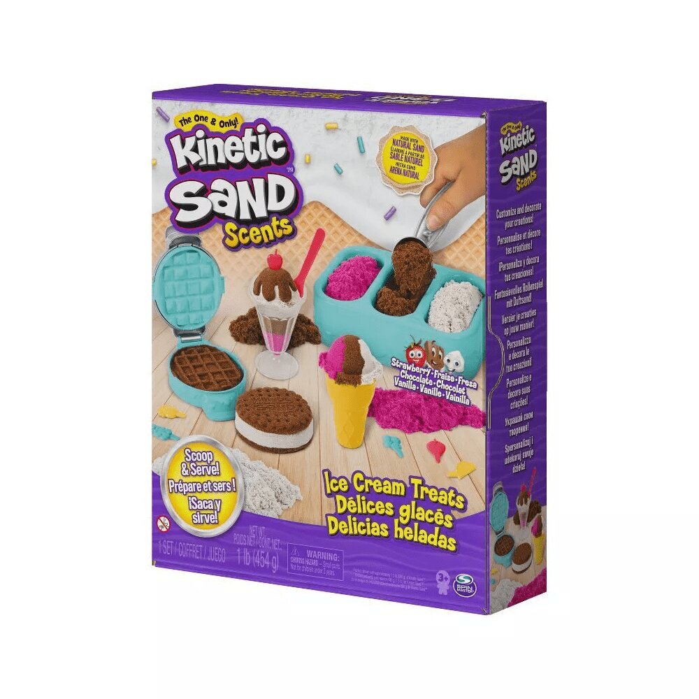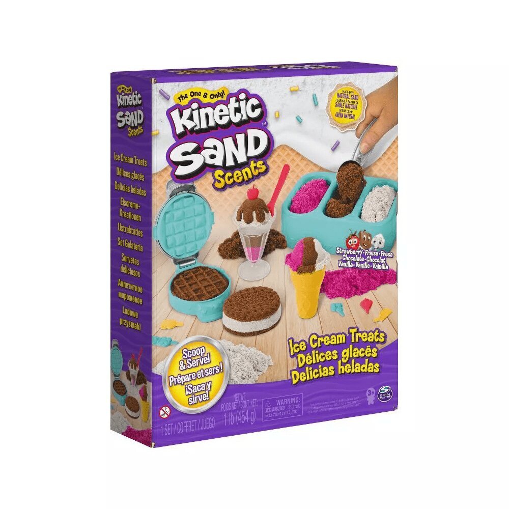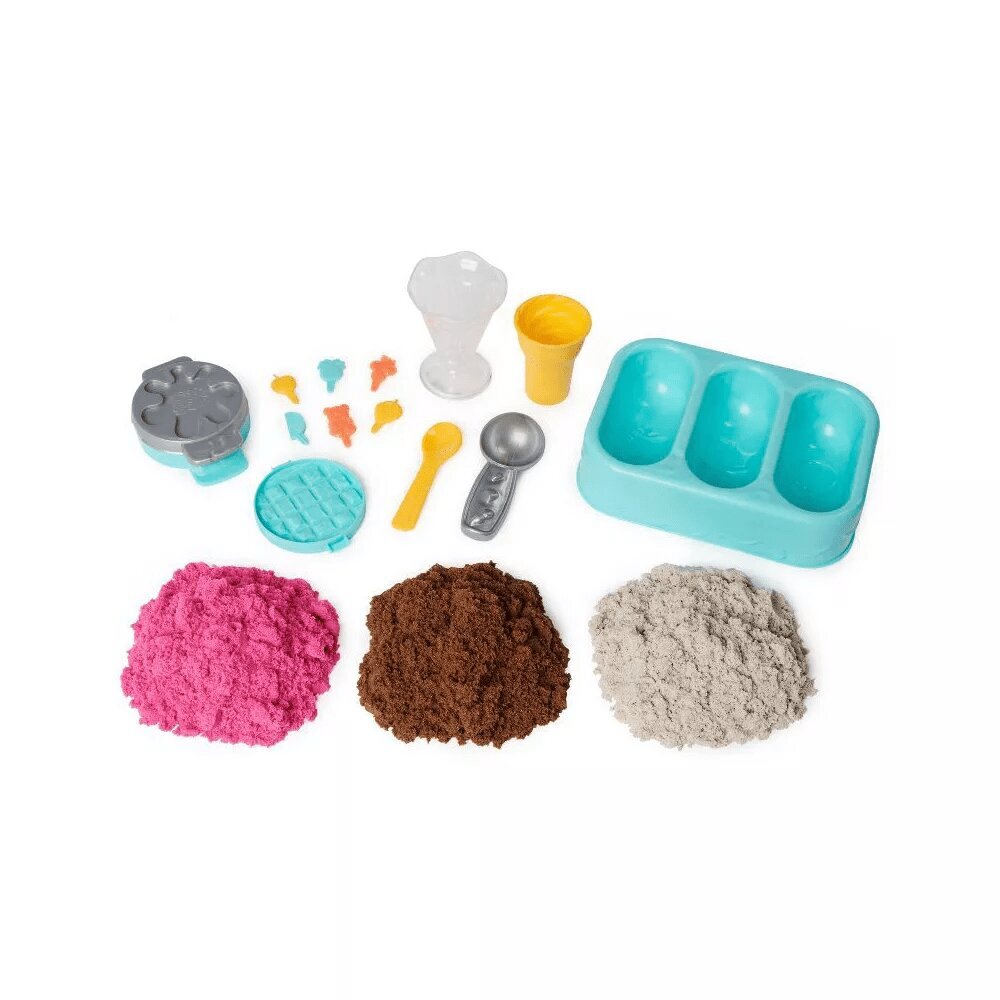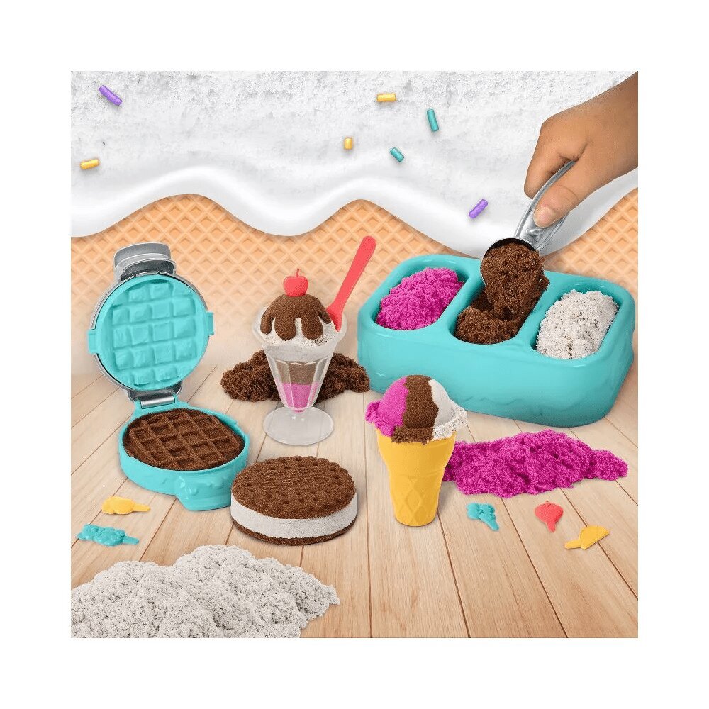 Poslužite vlastite mirisne poslastice uz Kinetički pijesak – sladoledna poslastica! S tri boje mirisnog kinetičkog pijeska (ukupno 454g), šest različitih alata i kalupa te šest zabavnih dodataka za preljev, stvorite vesele sladolede, vafle, sladoledne kolačiće, kornete i još mnogo toga!