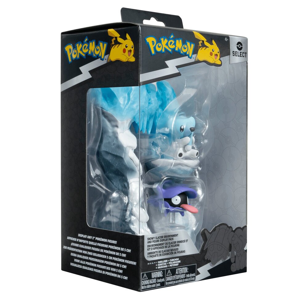 Pokémon Select Snowy Glacier set – ledena pustolovina za tvoje Pokémone! Ovaj detaljno izrađeni display set prikazuje snježnu ledenu pustoš s tri razine igre. Gornji dio oblikuje oštri greben prekriven ledenicama, srednja razina prikazuje stijenu idealnu za skokove, dok donji dio s ledenim jezerom sadrži plutajući komad leda. Set uključuje dvije Pokémon figurice – Shellder (Water) i Cubchoo (Ice), spremne za istraživanje ledenog terena. Savršen za kombiniranje s ostalim Pokémon Battle figuricama!