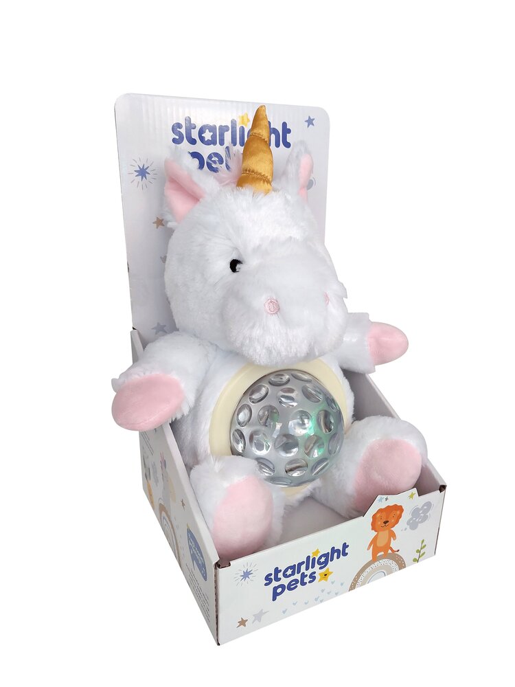 Plišani prijatelji za laku noć! Starlight Pets jednorog je interaktivna plišana igračka koja svijetli zvjezdanim svjetlom u različitim bojama dok svira melodiju “Blistaj, blistaj, zvijezdo mala”. Kada djeca krenu na spavanje, Starlight Pets interaktivna plišana igračka će ih opustiti i uspavati. Pritisnite kristalni trbuščić na igrački, on će zasvijetliti i melodija će zasvirati. Dvije funkcije: 1) Noćna svjetiljka (bijelo svijetlo) 2) Projicira zvijezde u bojama na zidove sobe dok svira laganu uspavanku. Za rad su potrebne 3 AA 1,5V baterije (uključene uz proizvod).