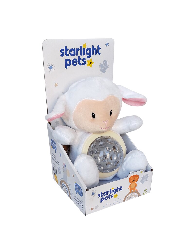 Plišani prijatelji za laku noć! Starlight Pets ovčica je interaktivna plišana igračka koja svijetli zvjezdanim svjetlom u različitim bojama dok svira melodiju “Blistaj, blistaj, zvijezdo mala”. Kada djeca krenu na spavanje, Starlight Pets interaktivna plišana igračka će ih opustiti i uspavati. Pritisnite kristalni trbuščić na igrački, on će zasvijetliti i melodija će zasvirati. Dvije funkcije: 1) Noćna svjetiljka (bijelo svijetlo) 2) Projicira zvijezde u bojama na zidove sobe dok svira laganu uspavanku. Za rad su potrebne 3 AA 1,5V baterije (uključene uz proizvod).