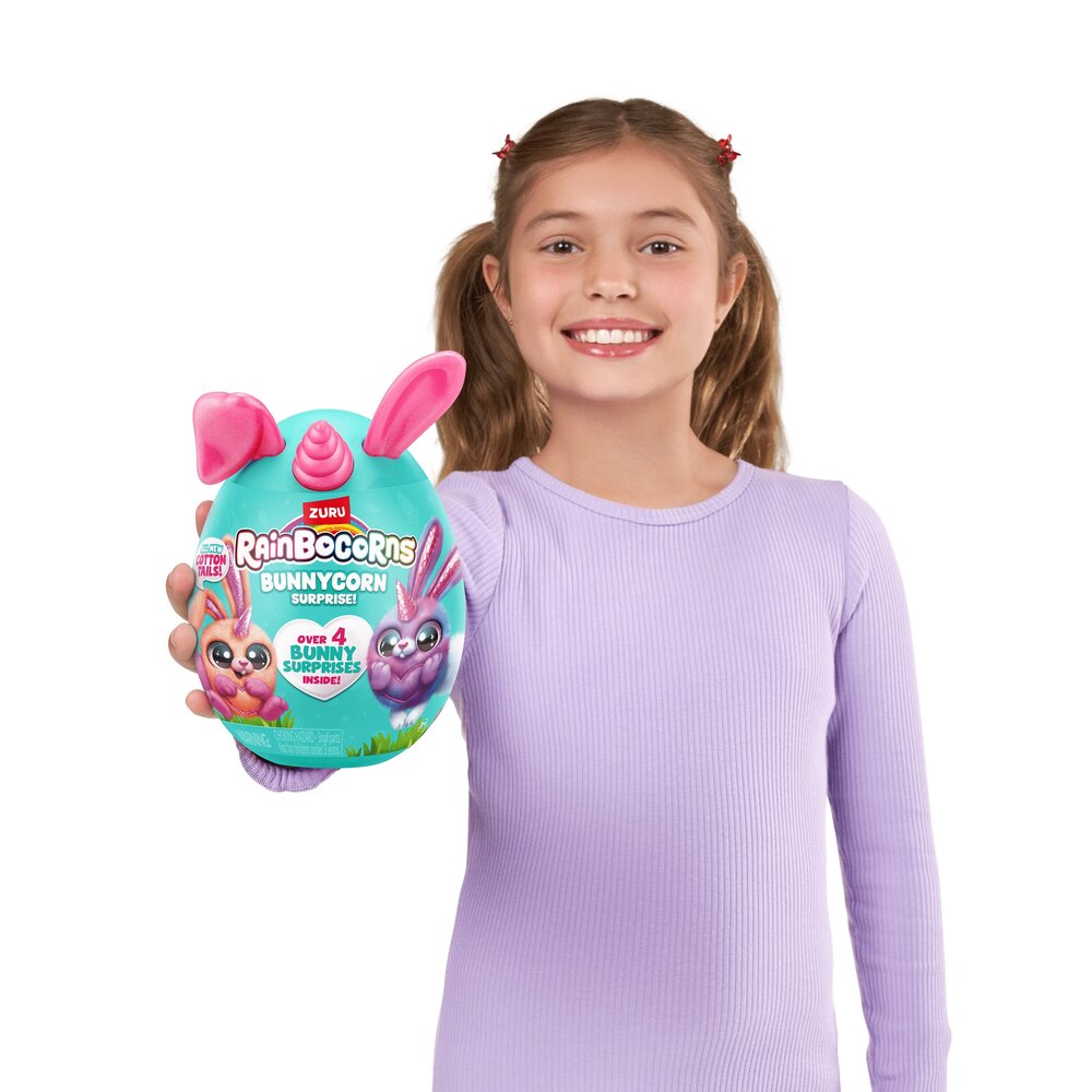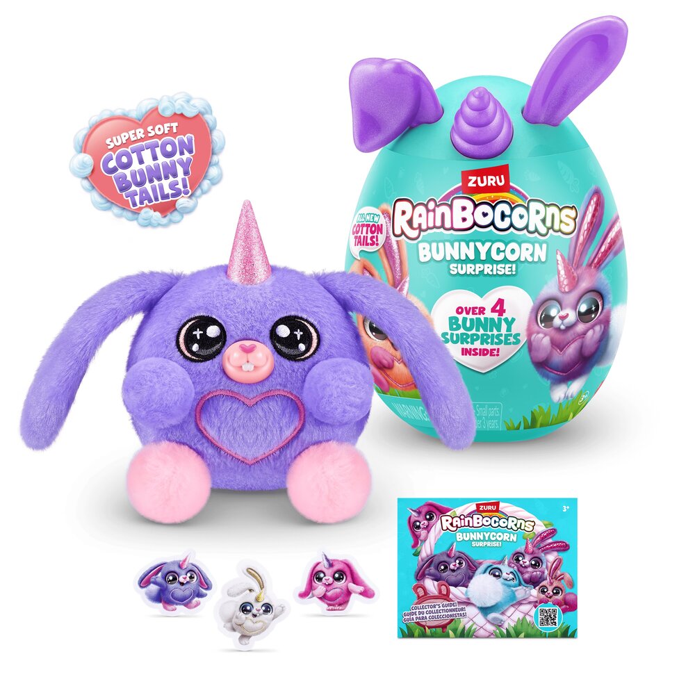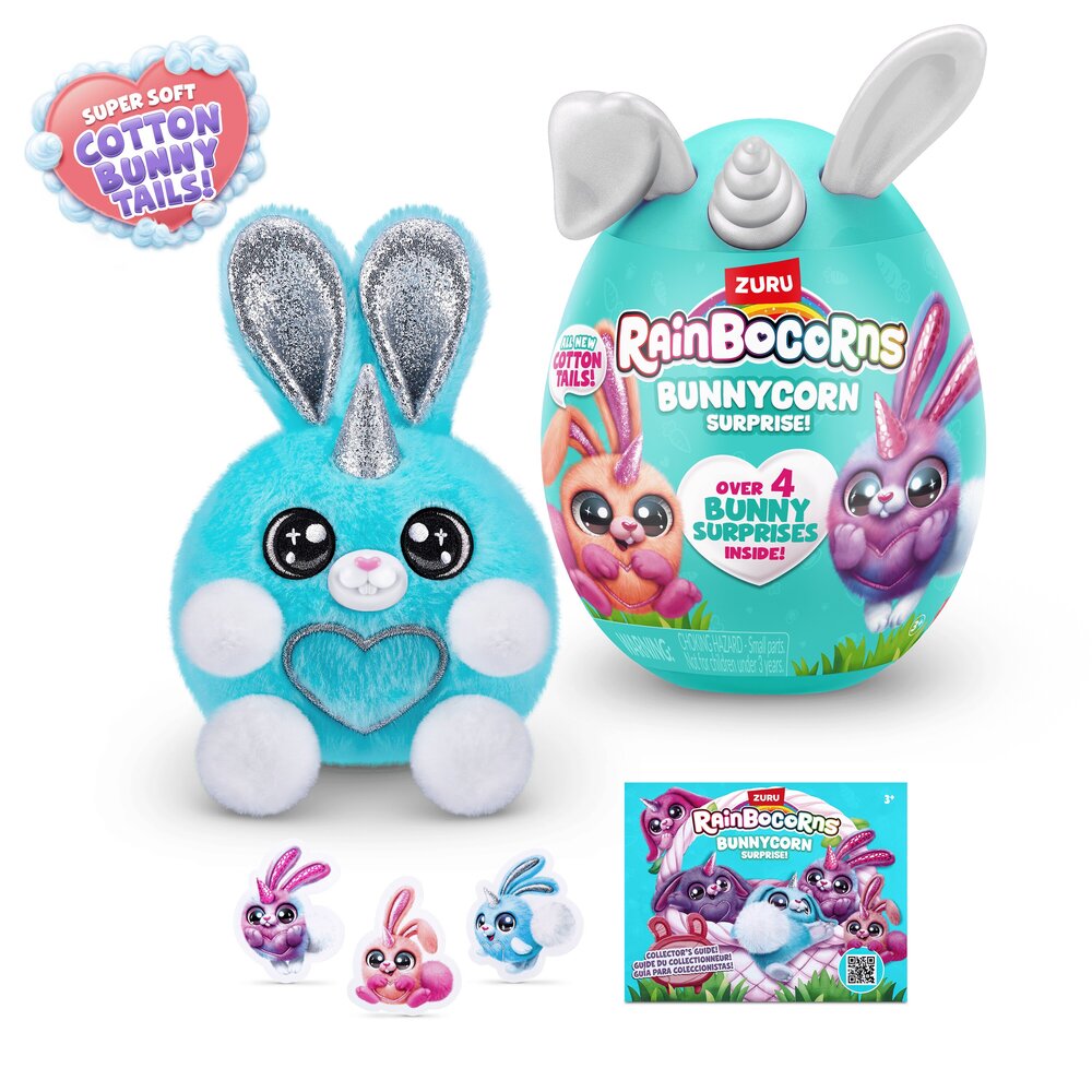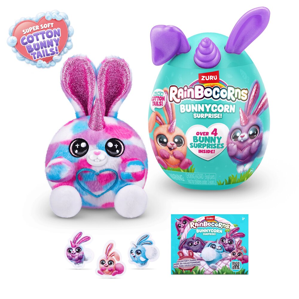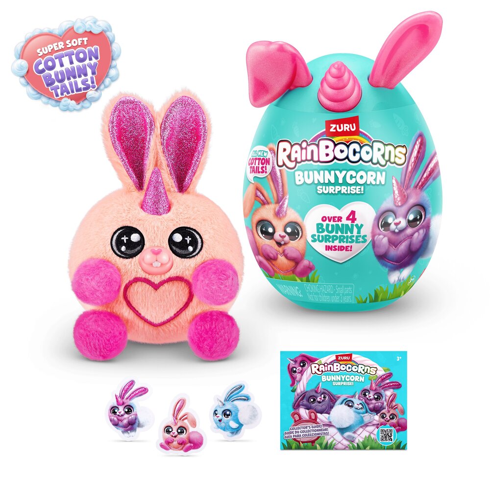 Rainbovilleom skakuću najslađi mališani zečjih ušiju koje si ikada srela! Novi Rainocorns Bunnycorns jaja iznenađenja skrivaju 6 plišanih zečića koja možeš sakupiti u jedinstvenu medenu zečju kolekciju. Svako jaje skriva 4 iznenađenja koja dolaze uz Bunnycornsa, uključujući slatki pamučni repić i naljepnice kojima možeš ukrašavti što god ti padne na pamet. Ovi medeni plišanci jedva čekaju doskakutati u tvoj zagrljaj! Dob 3+.