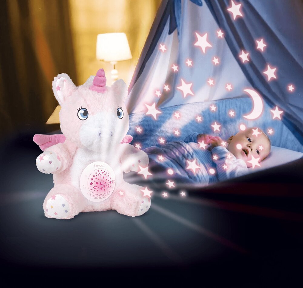 Moonlight Buddiezzz su jedini plišanci za bebu koji će vam zaista trebati! Ovi medeni plišanci dizajnirani su kako bi svojom pojavom i nježnim izgledom umirili bebu, a tehničke mogućnosti uređaja koji je ugrađen u trbuščić igračke pomoći će i najtežim slučajevima nervoze zbog kolika ili izbijanja zubića. Uređaj reproducira deset umirujućih melodija uspavanki, a s mogućnošću odabira pet razina glasnoće uvijek ćete moći reprodukciju prilagoditi potrebama vaše bebe. Uređaj emitira bijeli šum, među mamama omiljen zvuk koji bebe vole, a pomaže pri zatomljavanju vanjskih ometajućih zvukova. Uz pomoć mjerača vremena možete podesiti duljiu reprodukcije uređaja prema svojim potrebama, a dodatnu draž ovoj lijepoj plišanoj igrački daje i LED svjetlo koje svojim blagim radom pridonosi umirujućim osjećajima. Uređaj ima i opciju prikaza zvjezdanog neba koje će dodatno ukrasiti ionako lijepu atmosferu oko bebine kolijevke. Ova plišana igračka iznimno se lako održava – jednostavno izvadite uređaj iz trbuščića igračke te operite plišani dio kako bi uvijek bio potpuno higijenski prikladan za vaše najmanje. Igračke su dizajnirane u nekoliko primamljivih životinjskih likova, visine oko 30 cm. Za ispravan rad uređaja potrebne su 3x AAA baterije (nisu uključene uz proizvod). Preporučena dob: 0+.