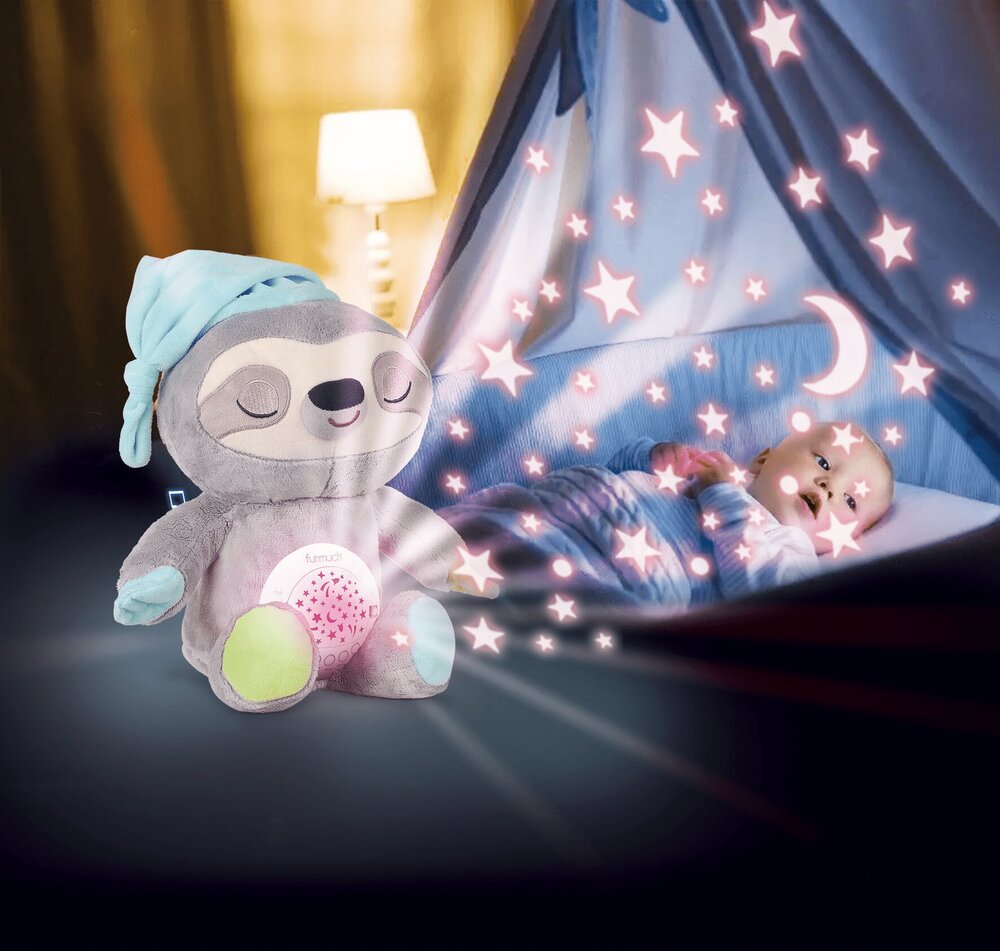 Moonlight Buddiezzz su jedini plišanci za bebu koji će vam zaista trebati! Ovaj simpatični ljenjivac ima detalje veselih boja koje odmah privlače pažnju, a njegov nježan izgled i meki materijal osiguravaju osjećaj sigurnosti i ugode već od prvog dana života. U trbuščiću plišanca nalazi se uređaj koji reproducira nekoliko različitih melodija uspavanki, uključujući i popularni bijeli šum – zvuk koji pomaže bebi da lakše utone u san zatomljujući vanjske zvukove. Moguće je birati između nekoliko razina glasnoće kako bi glazba uvijek bila prilagođena potrebama vaše bebe. Ljenjivac također svijetli umirujućim LED svjetlom te projicira prekrasne prizore na strop, stvarajući opuštajuću atmosferu u dječjoj sobici. Posebna funkcija nježnog njihanja dodatno doprinosi uspavljivanju jer oponaša efekt ljuljuškanja. Zahvaljujući mjeraču vremena, možete jednostavno odabrati trajanje rada uređaja. Plišani dio se lako održava – samo izvadite elektronički modul i operite igračku. Uređaj radi na 3x AAA baterije (nisu uključene). Visina igračke je oko 30 cm. Preporučena dob: 0+.